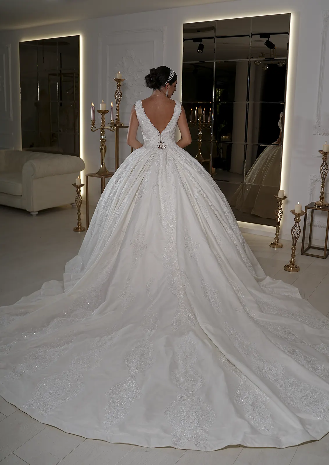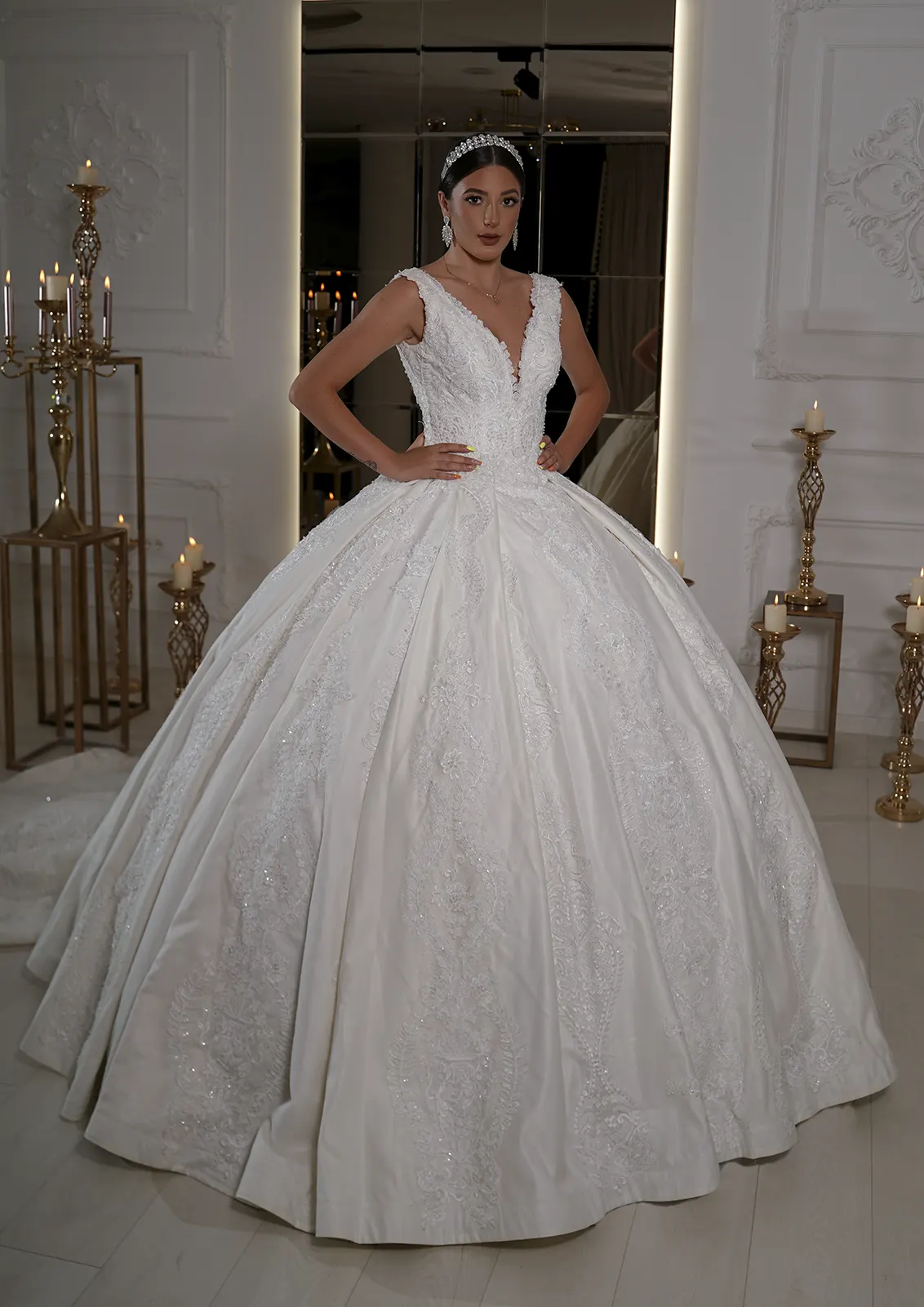 V neckline bridal ball gown in white satin and vintage floral appliqué beaded in small pearls featuring a a long train and a lace up back.