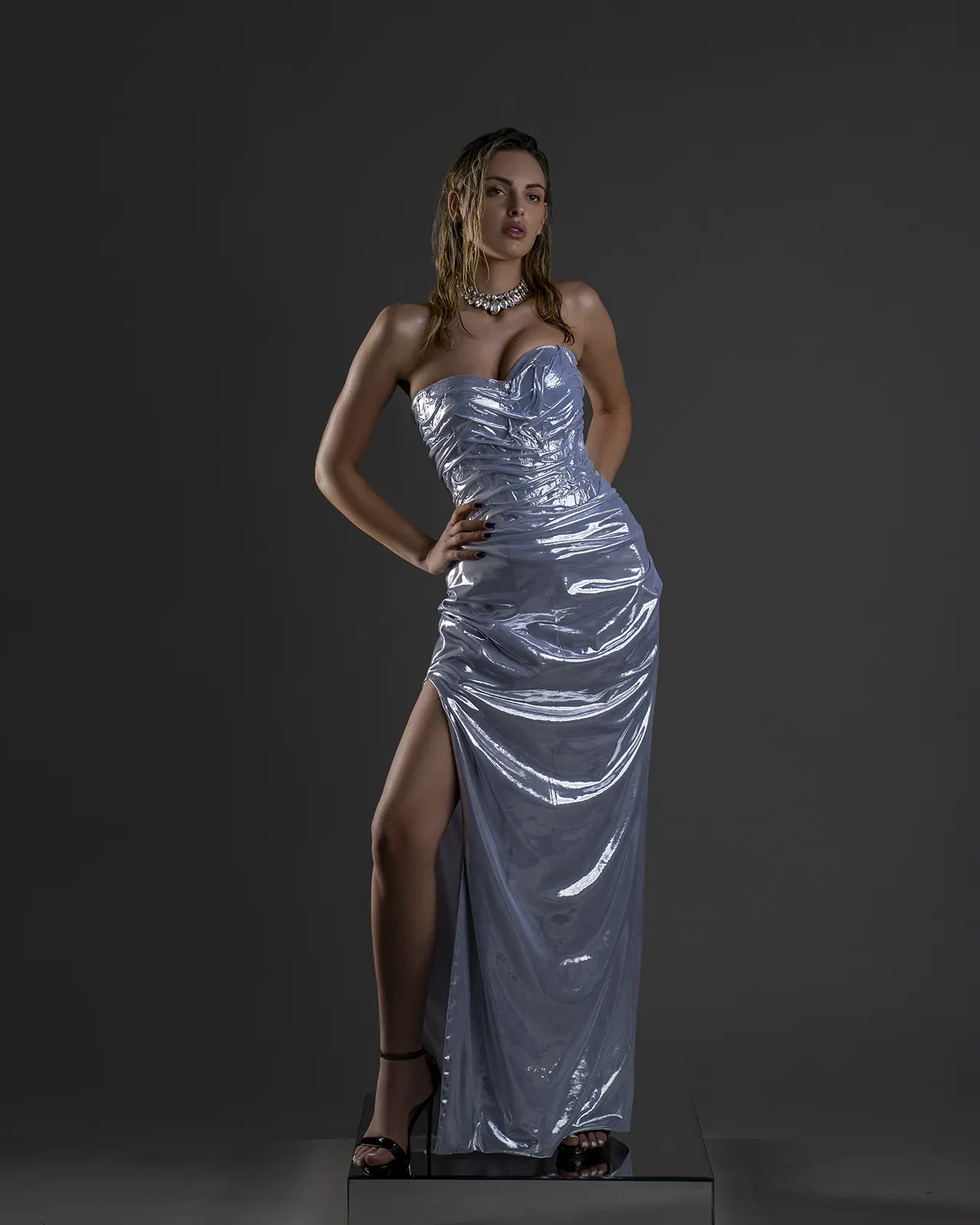 Created in lurex jersey the dress is crafted in a corset to give a wet look image. This maxi dress in created in lightweight fabric for the summer nights out.