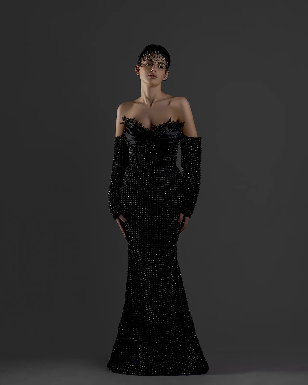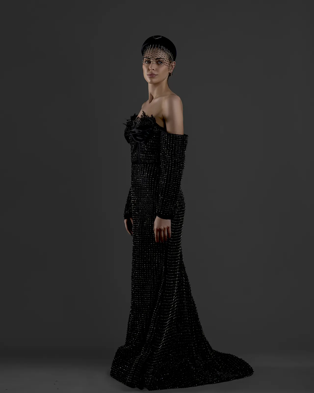 A significant prom look in a mermaid tail shaped dress. The dress features a rhinestone net finished with lace in the upper part of the corset of the dress. The tiny glitz of rhinestones give life to a walking godess was the inspiration behind the dress.