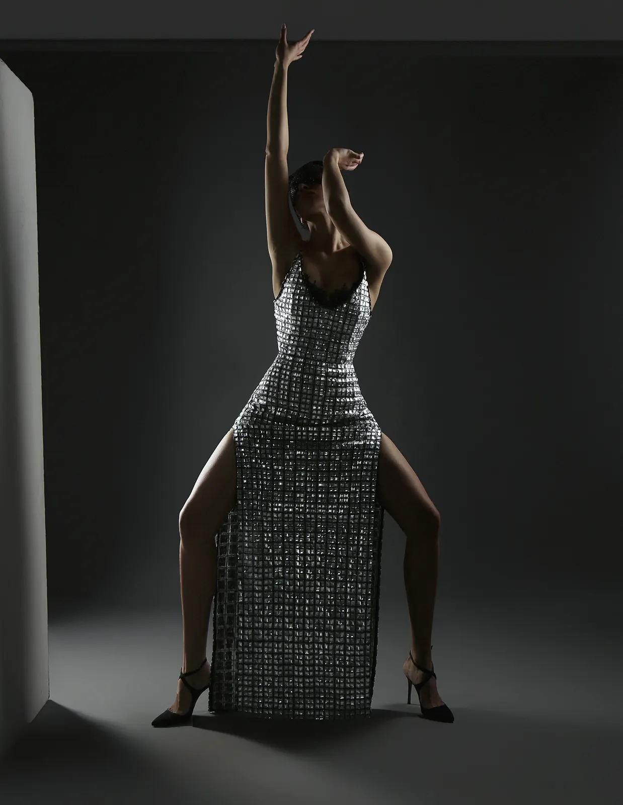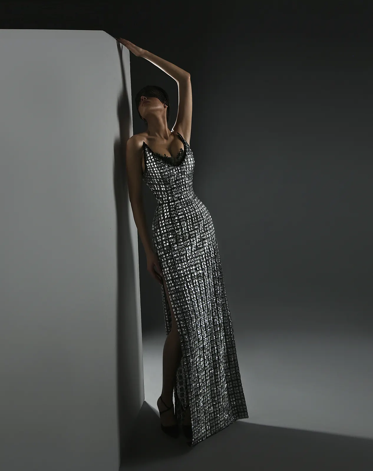 A disco core-inspired dress brought as an evening couture statement piece. This silver maxi dress features a strong-shaping corset and two high slits on the side. Crafted in glass beads and square-shaped rhinestones resembling a disco ball pattern. Finished in French lace applique in the chest area to give a dark feminine touch.
